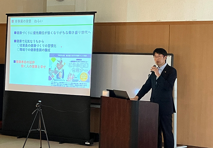 山梨県甲府市において、働き盛り世代の従業員を対象とした健康づくりを実施。運動習慣づくりや食生活改善を目的とした健康セミナーを開催。セミナーは「リアル」・「オンライン」・「アーカイブ」にて実施することで、より多くの参加者受講を支援。多くの事業所にご参加いただく為、宣伝活動も併せて実施。参加者のニーズをセミナーへの内容反映を目指し、企業課題のヒアリング活動や事業効果を測定するアンケートの実施。多くの取組で事業所の健康経営をサポートしました。